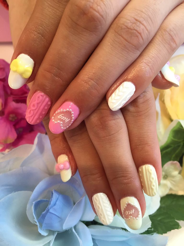 ハートのくり抜きにニットネイル3Ⅾを載せてとってもかわいく仕上がりました![]()