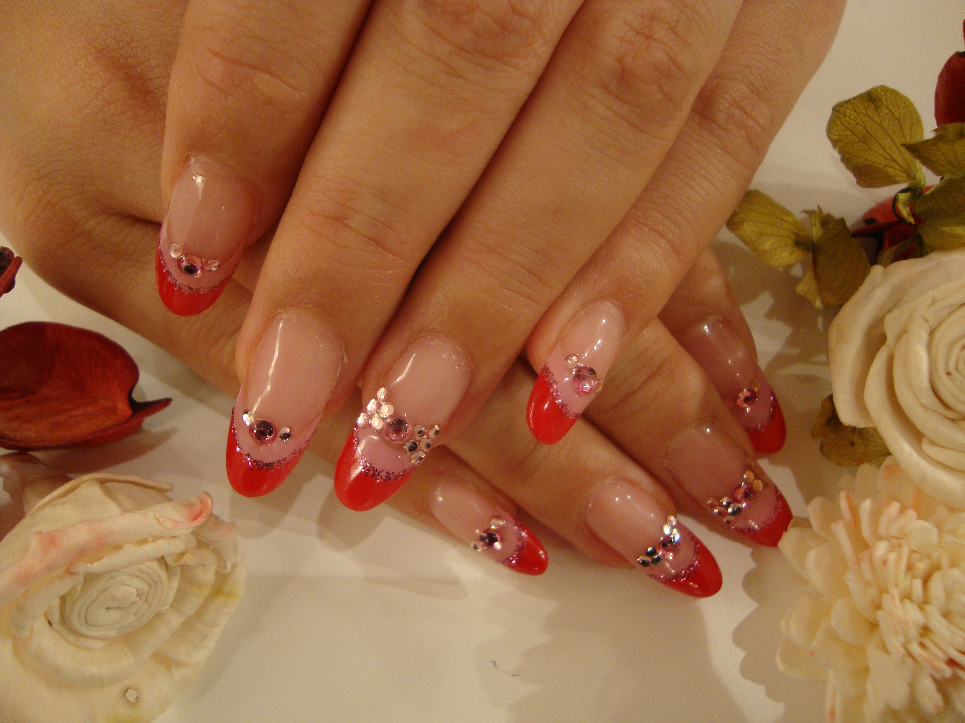 赤とピンクの境目にラメのラインを、ピンクとクリアの境目にピンク系のストーンを乗せてみました
