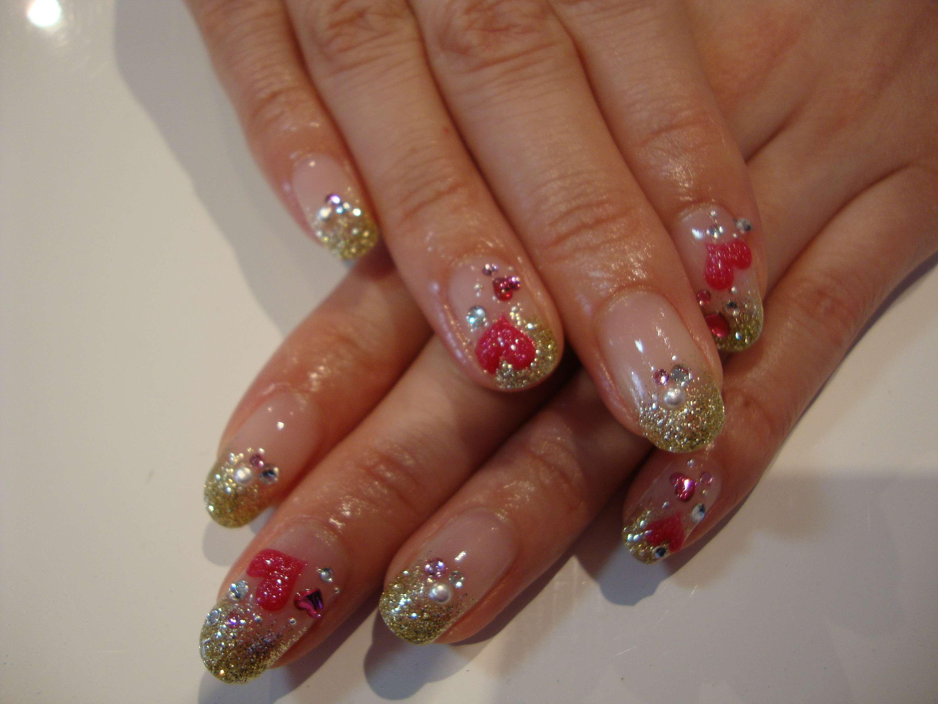 ゴールドのラメグラデにハートの3D、ストーンアート